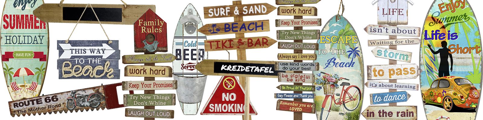 Verschiedene Schilder und Wandhänger mit Sprüchen, Motiven oder Themenbezogen